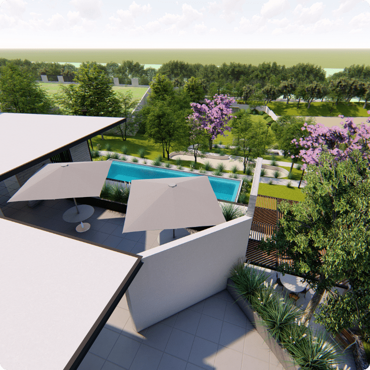 El proyecto aprovecha al máximo la topografía del terreno para urbanizar, priorizando las increíbles vistas panorámicas hacia el bosque.